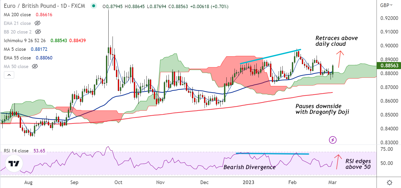 Summary: EUR/GBP has bounced off daily cloud support with a Dragonfly Doji formation. Price action has retraced above 200H MA, scope for further gains.