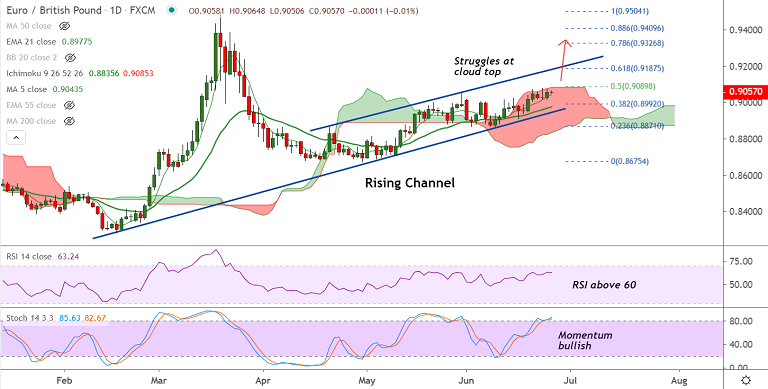 The pair is extending trade in a 'Rising Channel' pattern, is struggling at cloud top at 0.9085, break out of cloud to see further gains.