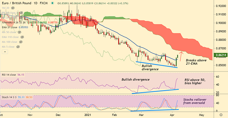 EUR/GBP is trading 0.21% higher on the day at 0.8607 at around 06:30 GMT, extending the previous session's whopping 1.14% gains.