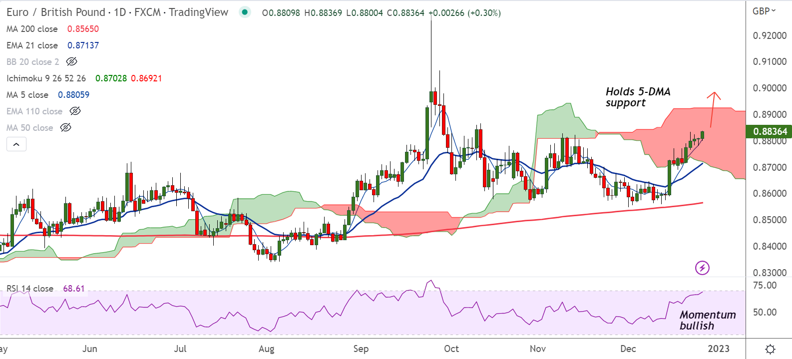 Summary: EUR/GBP trades with a bullish bias. Scope for test of cloud top at 0.8924. Decisive breakout above cloud will fuel further upside.
