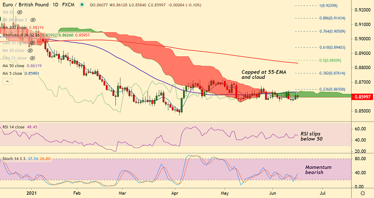 Summary: EUR/GBP trades with a bearish bias. The pair finds stiff resistance at 55-EMA, any upside only on decisive break above.