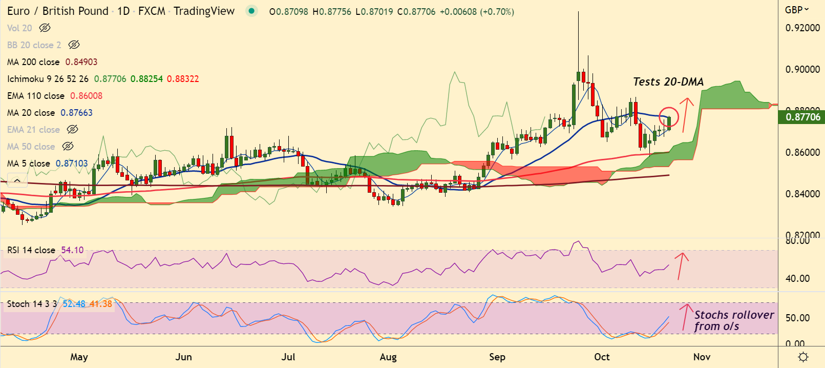 Summary: EUR/GBP was trading with bullish bias. Scope for test of fresh monthly highs above 0.88 mark.