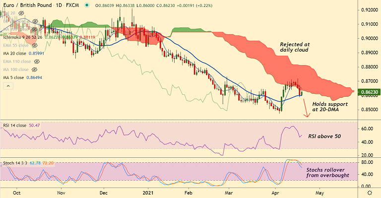 The pair is set to snap a 3-day losing streak a price action finds strong support at 20-DMA at 0.8619.