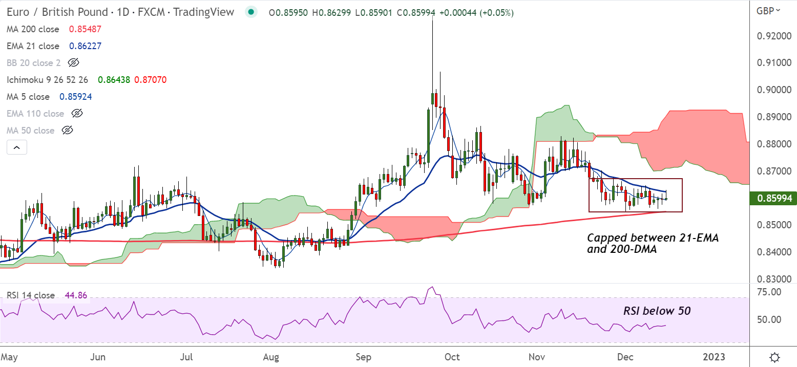 Summary: EUR/GBP capped between major moving averages - 21-EMA and 200-EMA. The pair is likely to grind sideways till it finds a major catalyst. Decisive breakout will provide a clear directional bias.