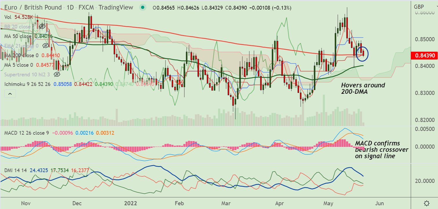 Summary: EUR/GBP pivotal at 200-DMA support. Technical indicators support downside in the pair. Watch out for break below 200-DMA for further weakness.