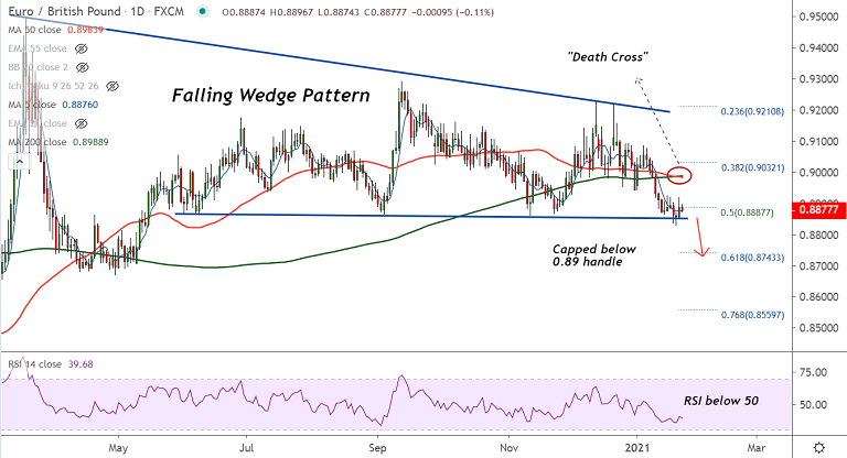 The pair trades with a bearish bias. Price action has failed to extend above 200H MA. Further, 'Death Cross' confirmed on the daily charts is likely to keep downside pressure.