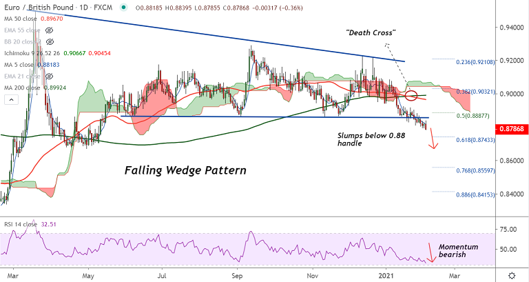 'Death Cross' (bearish 50-DMA crossover on 200-DMA) reinforces downside. Next major bear target lies at 61.8% Fib at 0.8743.