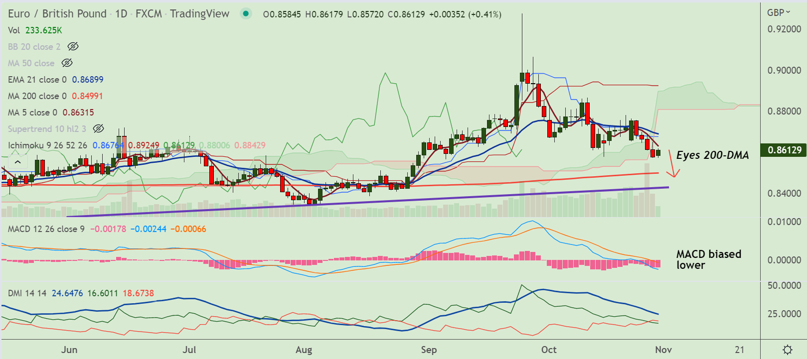 The pair is on track to test 200-DMA support. Bearish invalidation only above 21-EMA.