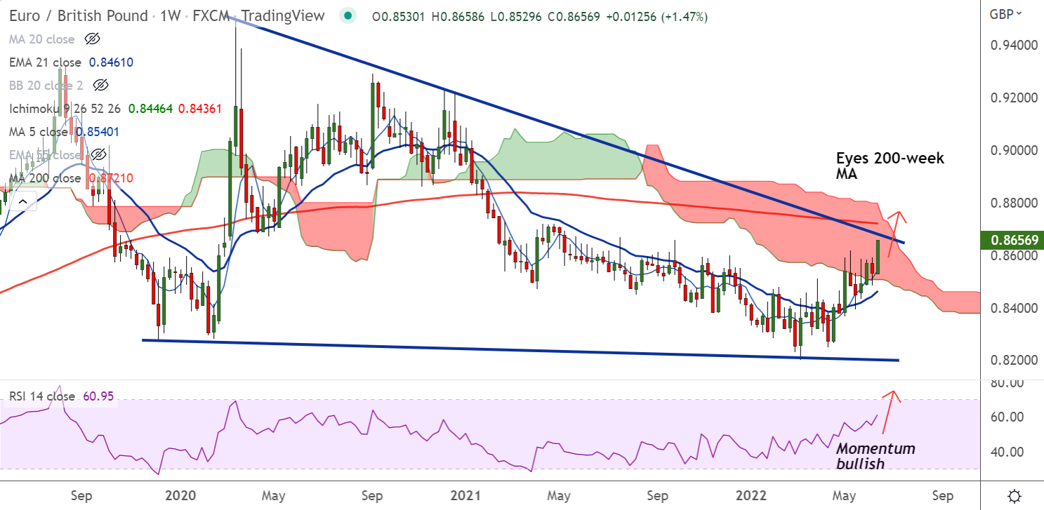 Summary: EUR/GBP trades with a bullish bias. The pair had been capped at 110-week EMA from the past few weeks. Break above raises scope for further gains.