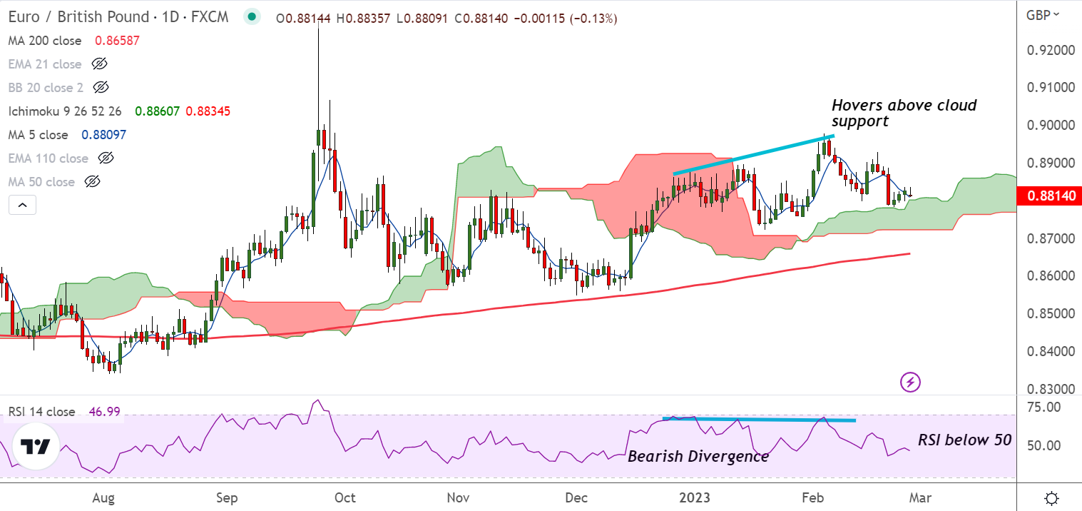 Support levels - 0.8809 (nearly converged cloud top, 5-DMA and 55-EMA), 0.8750 (110-EMA)