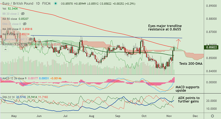 EUR/GBP spikes higher for the second straight session, tests 200-DMA resistance, outlook bullish.