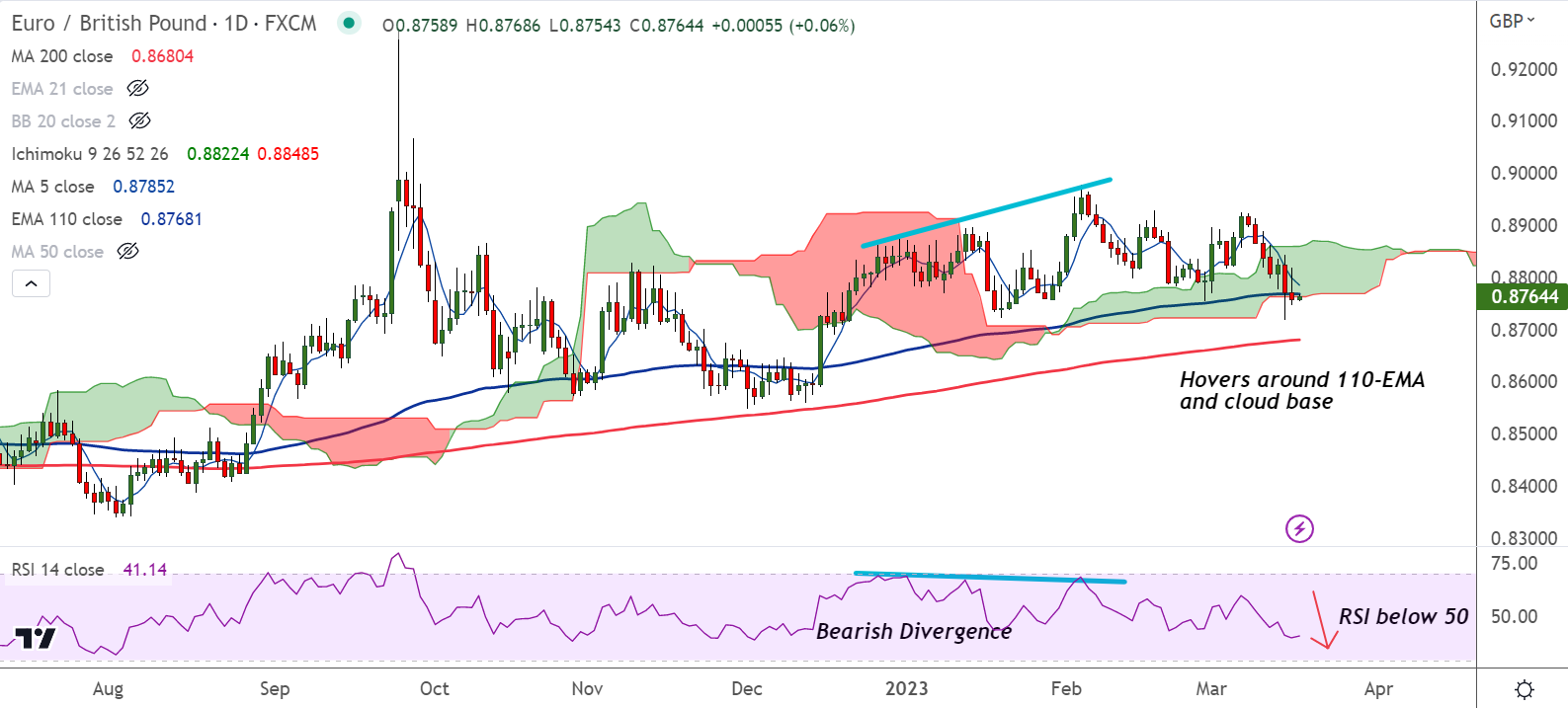 EUR/GBP was trading in a narrow 14 pip range, extends sideways at cloud base and 110-EMA.