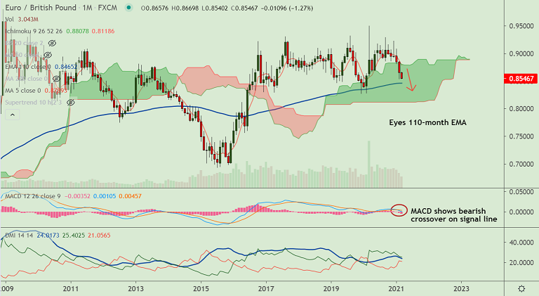 EUR/GPB trades with a bearish bias. Technical indicators point to further weakness. Scope for test of 110-month EMA at 0.8465.