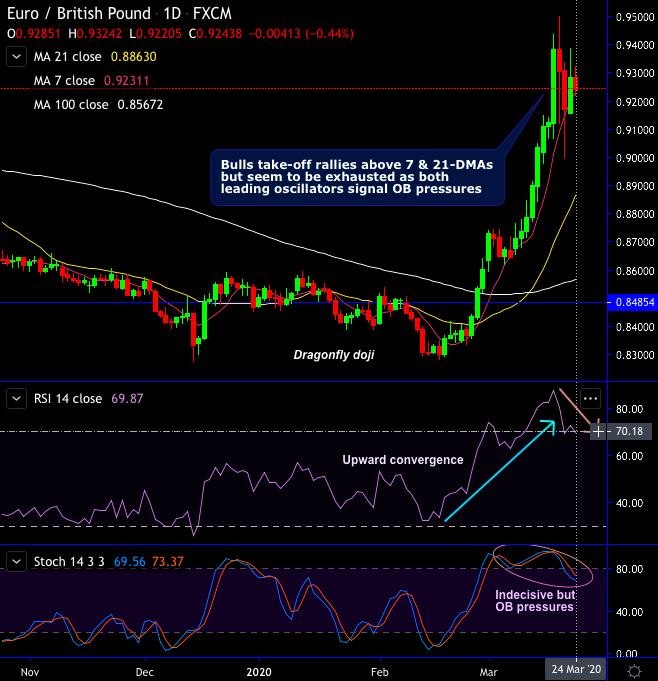 EURGBP minor trend has taken off rallies above 7 & 21-DMAs but now seems to be exhausted as both leading oscillators (RSI & Stochastic curves) signal overbought pressures.