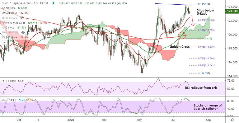 Summary: Weakness in the pair is likely to be capped at 110W EMA. 'Golden Cross' on the daily charts cushions downside. Resumption of upside will see test of 200W MA at 124.76 ahead of 50% Fib at 125.95.