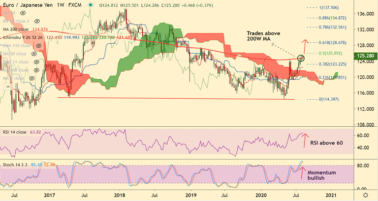 Summary: The pair trades with a strong bullish momentum. Price action has retraced brief dip below 200H MA and is set to resume upside. Weekly close above 200W MA will reinforce bullish stance.