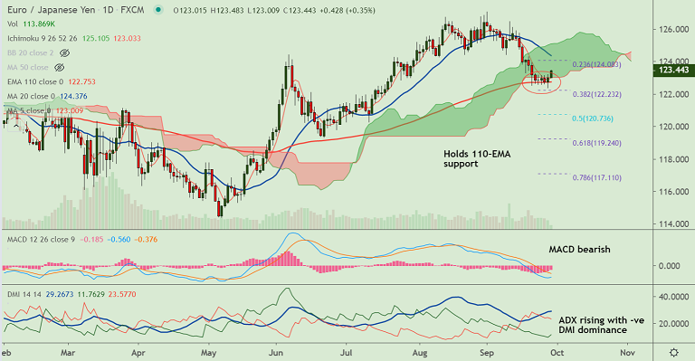 On the flipside, supports are located at 200H MA at 123.15, 110-EMA at 122.75 and lower Bollinger band at 122.06.