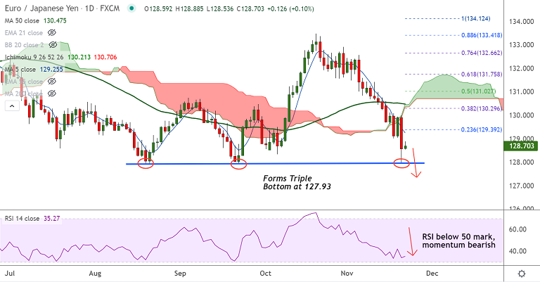 Summary: EUR/JPY trades with a bearish technical bias. Watch out for break below 127.93 for further weakness. Break above 5-DMA (129.26) to see more upside.