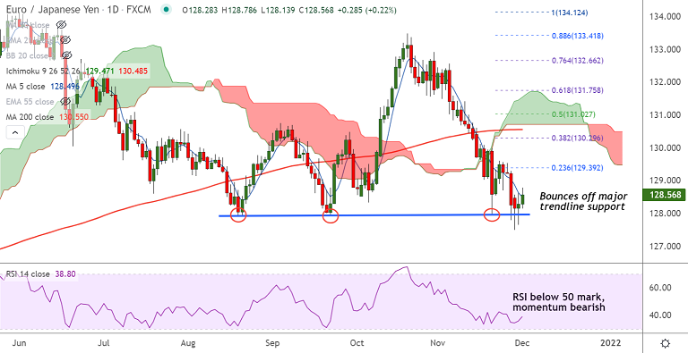 Summary: EUR/JPY has paused downside at major trendline support at 127.93. Decisive break below is required for further weakness.
