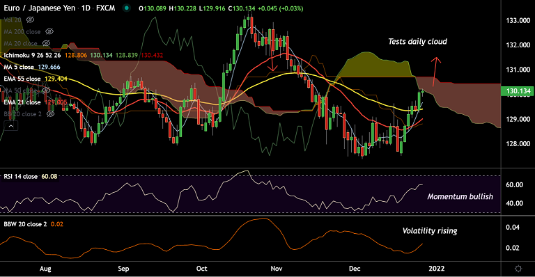 Summary: EUR/JPY is testing cloud resistance. The pair eyes 200-DMA at 130.46. Decisive break above will fuel further upside.