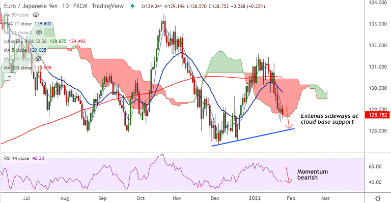 Summary: EUR/JPY trades with a bearish bias. Watch out for break below daily cloud for further weakness.