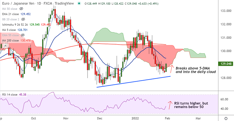 Summary: EUR/JPY poised for some gains after sideways grind. Scope for test of 21-EMA at 129.45. Break above will see further upside.