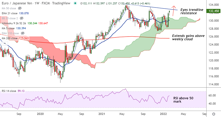 Summary: EUR/JPY trades with a bullish bias. The pair is on track to test trendline resistance at 132.95. Breakout above will fuel further gains.