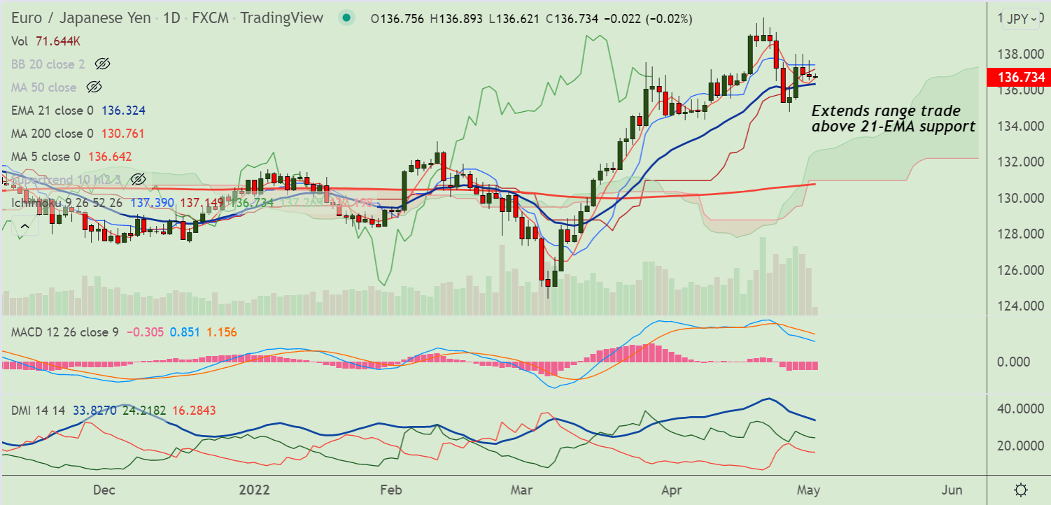 EUR/JPY was trading rangebound on the day as the pair extends sideways above 21-EMA support