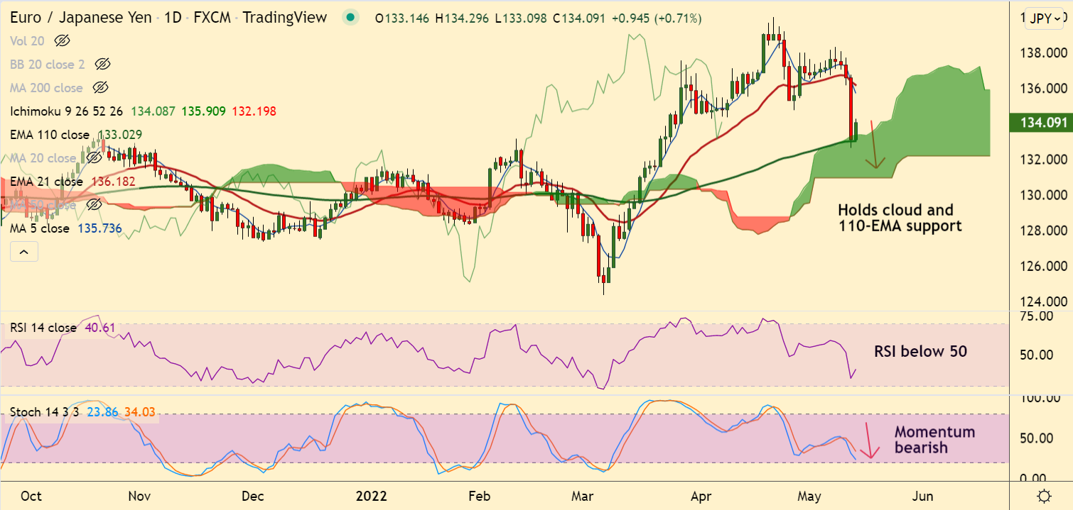 - EUR/JPY has paused downside at daily cloud top and 110-EMA support