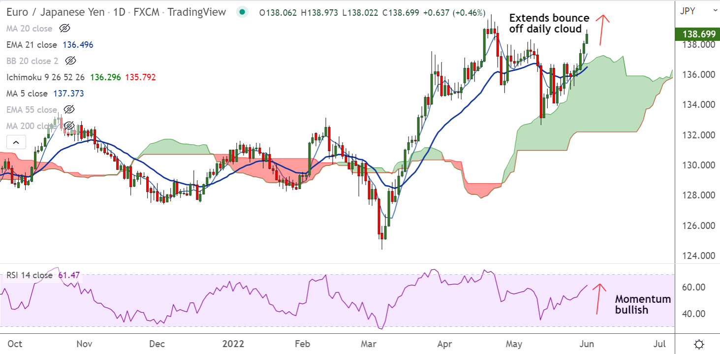 EUR/JPY was trading 0.44% higher on the day at 138.67 at around 10:15 GMT, outlook is bullish.
