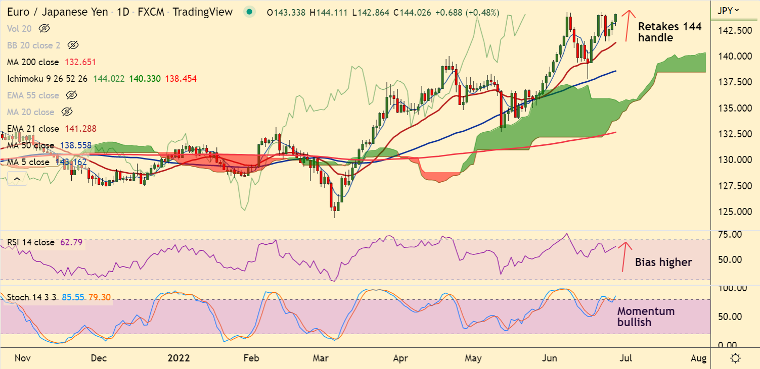 Summary: EUR/JPY trades with a bullish bias. The pair is on track to test 2015 Jan high at 145.32.