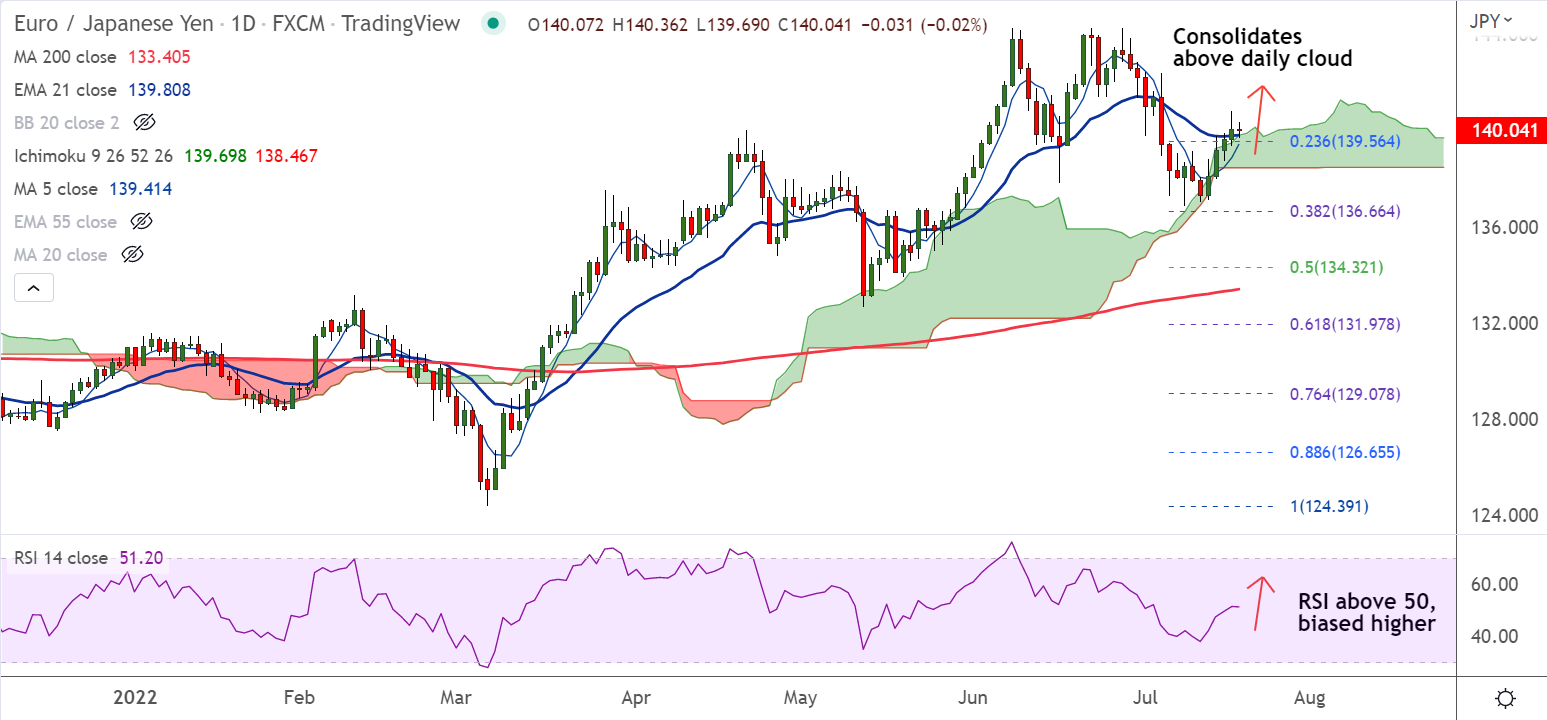 - The pair is consolidating in narrow range above daily cloud