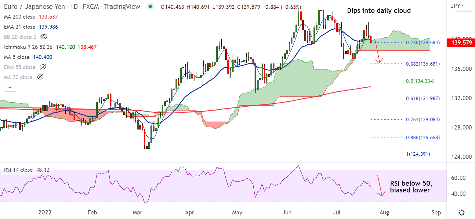 EUR/JPY was trading 0.61% lower on the day at 139.59 at around 10:10 GMT. The pair is slipping lower for the 3rd straight session, dips into daily cloud.