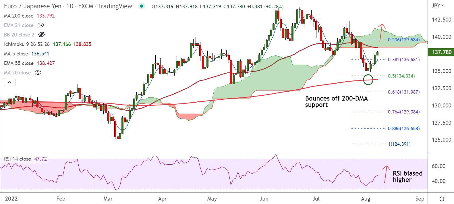 Summary: EUR/JPY stays in the green despite Italy’s political jitters. Downbeat Japan data, weekend numbers from China appear to keep the pair supported. 21-EMA is immediate resistance at 137.96. Watch out for decisive break above for upside continuation.