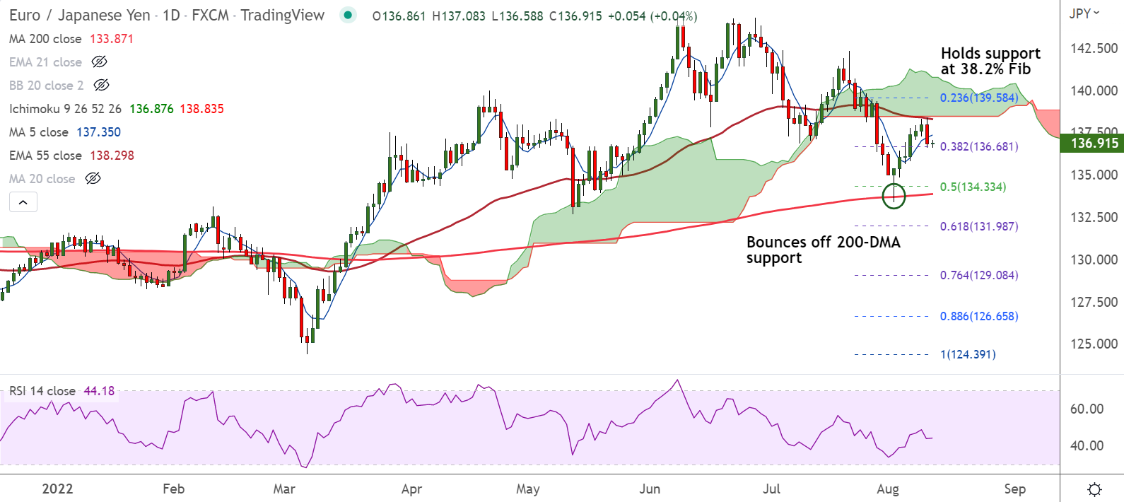 Support levels - 136.68 (38.2% Fib), 136.47 (200H MA)