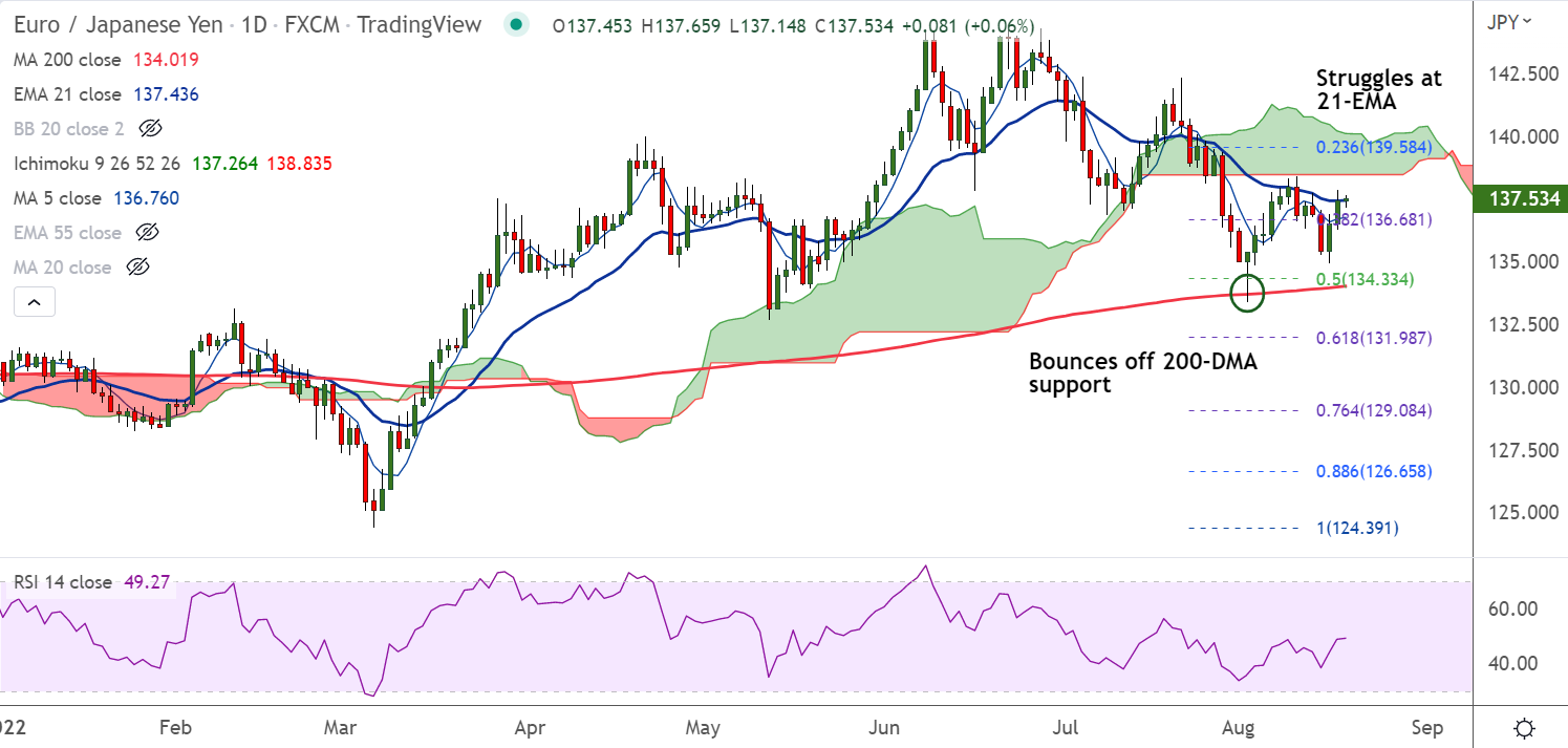 - The pair has been capped at 21-EMA which is offering stiff resistance at 137.43