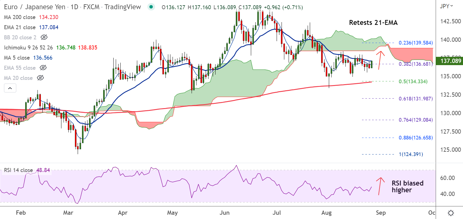 - EUR/JPY spikes higher to retest 21-EMA resistance