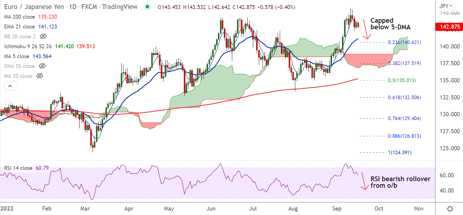 Summary: EUR/JPY poised for more downside. Upside remains capped at 5-DMA, scope for dip till 21-EMA at 141.12.
