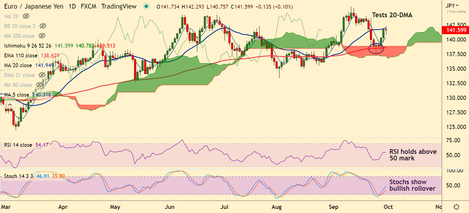 The pair has bounced off 110-EMA and daily cloud support and is testing 20-DMA resistance.