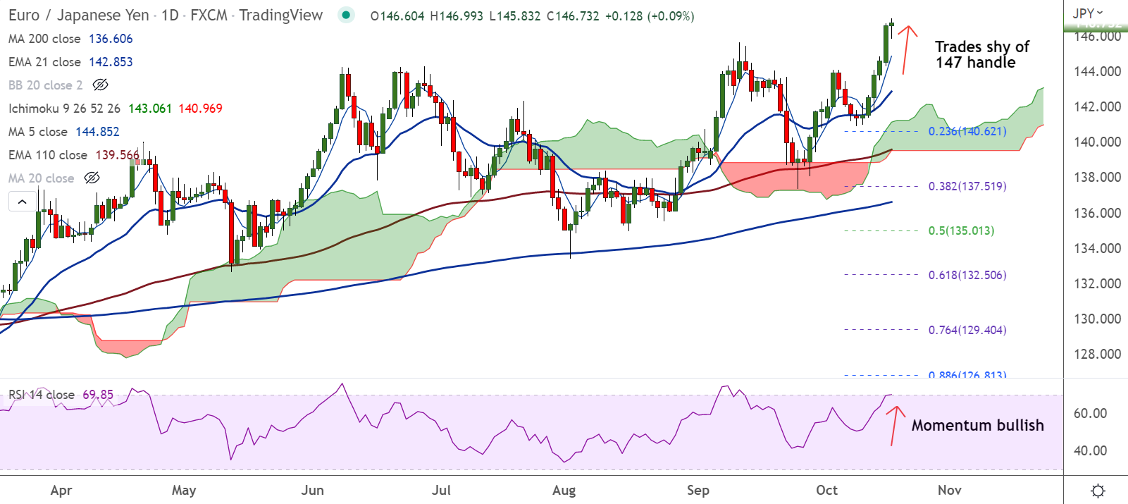EUR/JPY was trading 0.06% higher on the day at 146.71 at around 09:45 GMT.