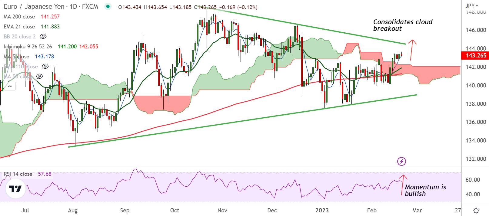 EUR/JPY was trading 0.06% lower on the day at 143.34 at around 10:17 GMT, outlook remains bullish.