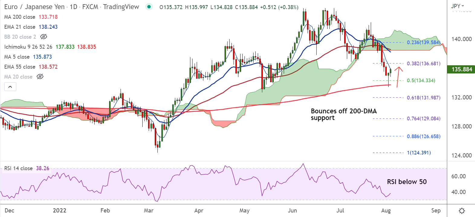 The pair is hovering around 5-DMA which is immediate resistance at 135.84, break above will see further gains.