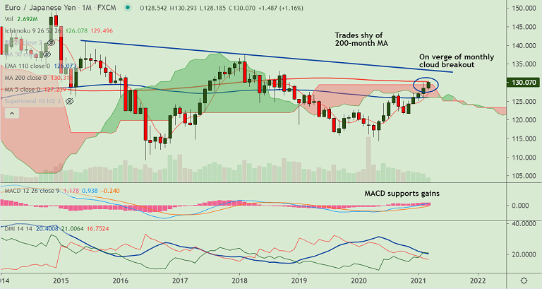 The pair is on an upward spiral for the 5th straight month and eyes 200-month Moving Average at 130.31.