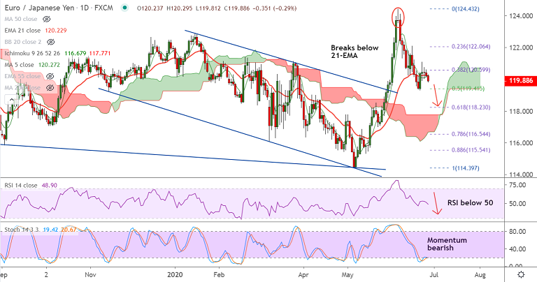 The pair has broken below 21-EMA, momentum remains bearish, scope for further weakness.