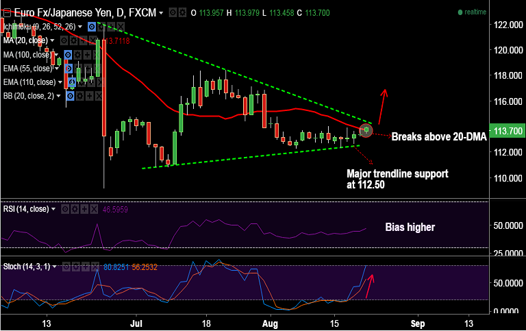 - EUR/JPY has broken major resistance by 20-DMA at 113.71, we see scope for test of next major hurdle at 114.40 (falling trendline).