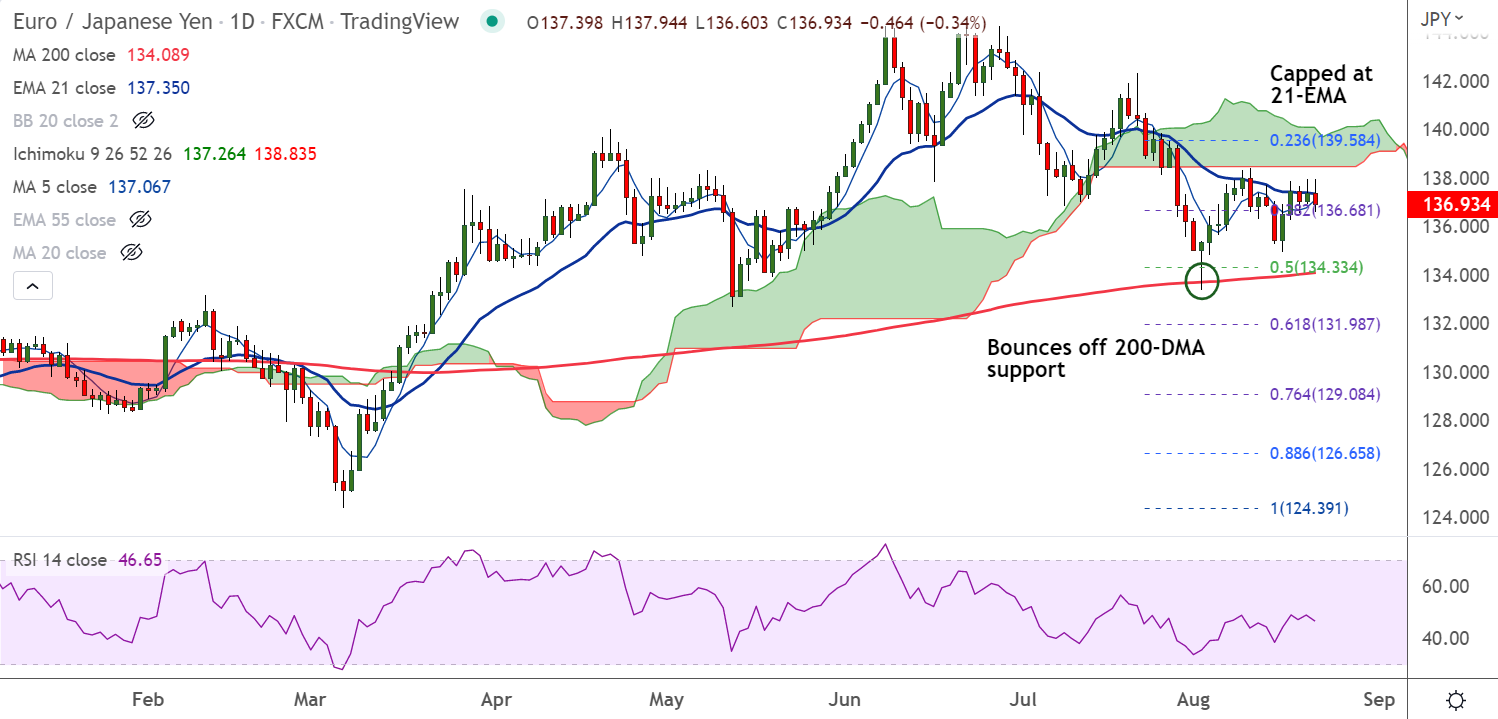 - The pair is struggling to break above 21-EMA which is capping upside at 137.35