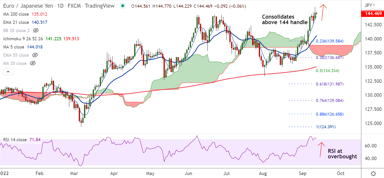 EUR/JPY was trading 0.10% lower on the day at 144.42 at around 05:41 GMT, consolidates previous session's gains.