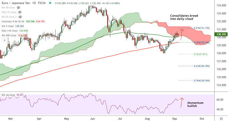 - EUR/JPY is consolidating break into the daily cloud, bias bullish