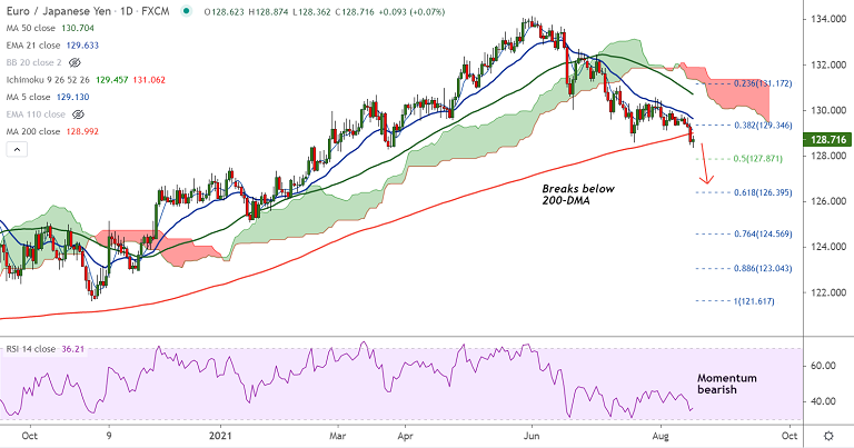 Resistance levels - 128.99 (200-DMA), 129.34 (38.2% Fib), 129.63 (21-EMA)