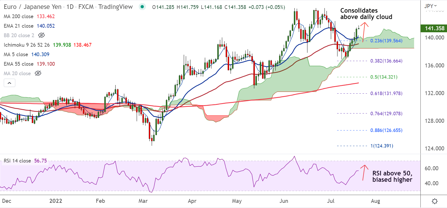 - EUR/JPY slips lower from session highs at 141.75, bias remains bullish